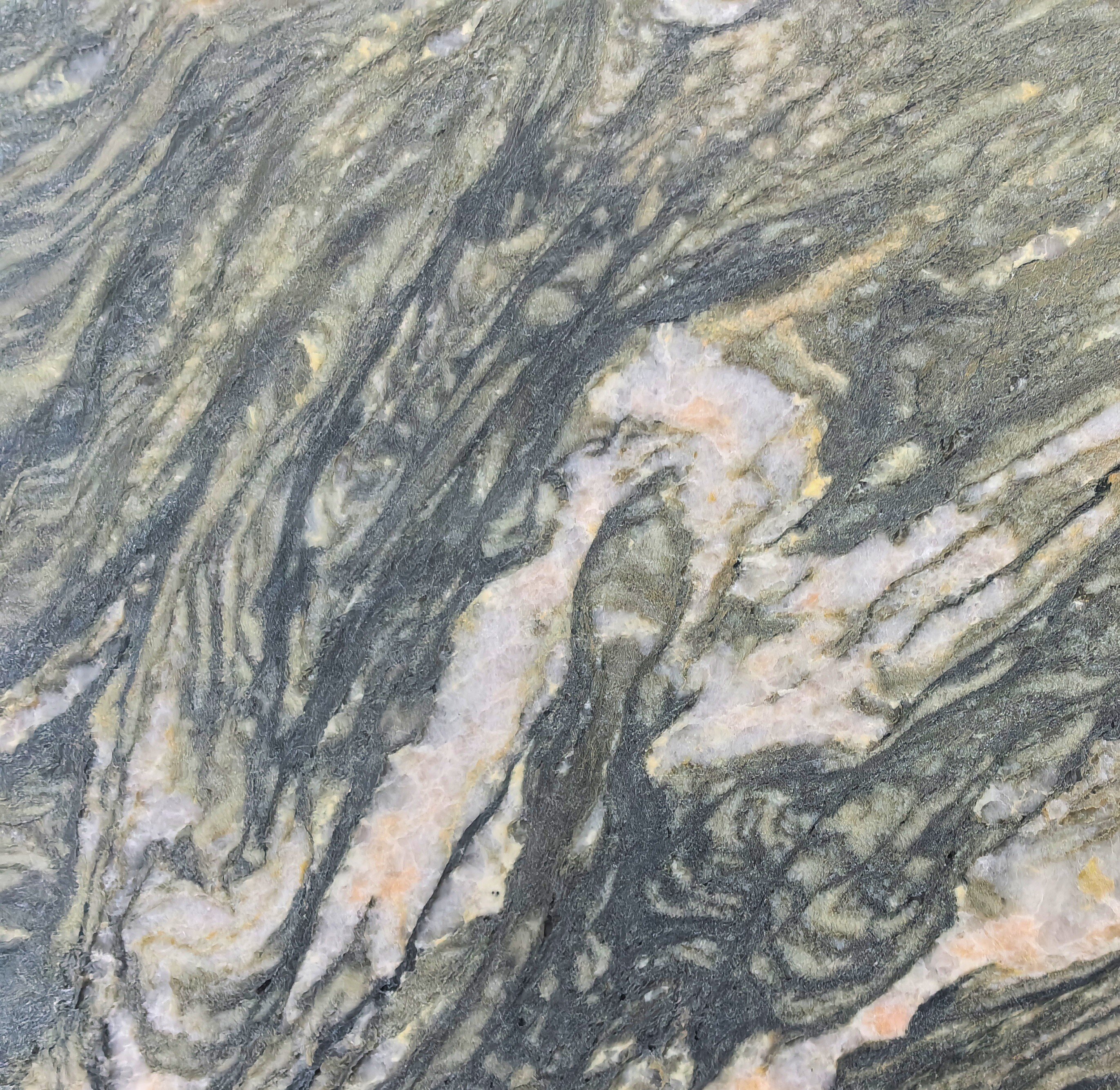 Abrolios Green Granite is a richly patterned green granite marked by flowing bands of sage, olive, charcoal, and soft ivory. Undulating layers of mineral movement sweep across the slab in dramatic waves, punctuated by quartz-rich sections with faint blush undertones that create depth and dimension.