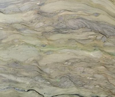 Alexandrita Granite is a green granite with flowing bands of sage, moss, and soft olive layered in sweeping, horizontal movement. Subtle undertones of gray-blue and muted sand weave through the surface, while gentle mineral transitions create a fluid, almost painterly composition across the slab.