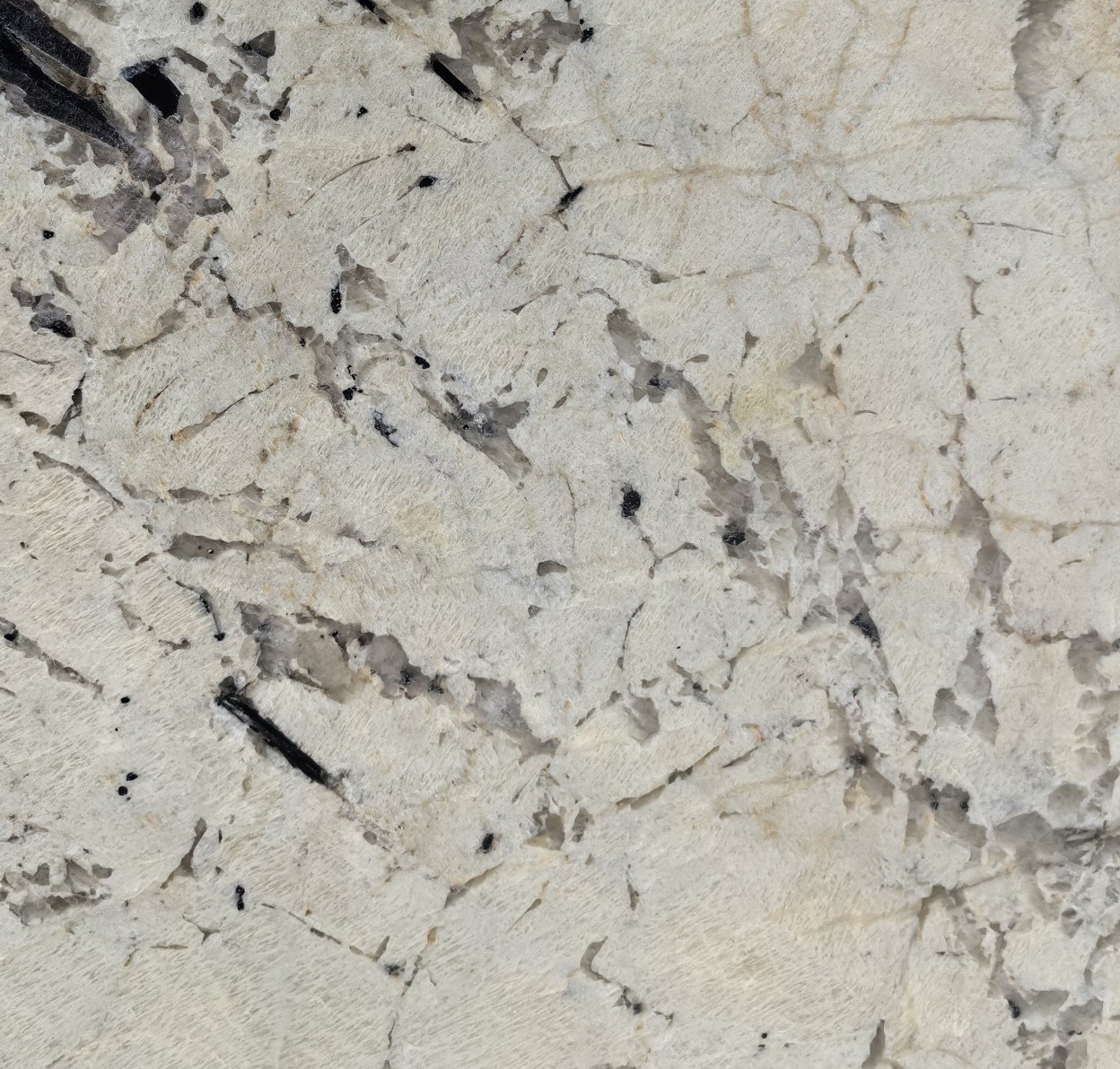 A beige and white granite with gold and grey veins.