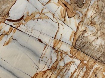 Blue Tortuga Granite features a pale gray to soft ivory background with a subtle blue undertone, layered with sweeping bands of warm beige, rust, and deep brown veining. Broad, fluid movements intersect with fine linear fissures, forming a complex network of directional and cross-cutting patterns. The composition shifts across the surface, balancing open areas of lighter ground with zones of concentrated mineral activity, giving the stone a dynamic and expressive character.