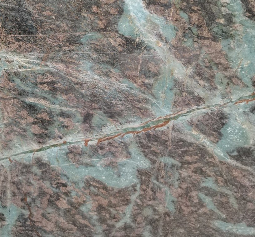Braziliano Granite presents a deep brown to charcoal base layered with sweeping veining in soft green, pale blue, and warm rust tones. Broad, intersecting mineral lines cut across the surface at varying angles, creating a fractured, almost geologic composition with both dense and open areas of movement. The contrast between darker ground tones and lighter veining gives the stone a sense of depth, while subtle crystalline texture adds reflectivity without overpowering the overall composition.