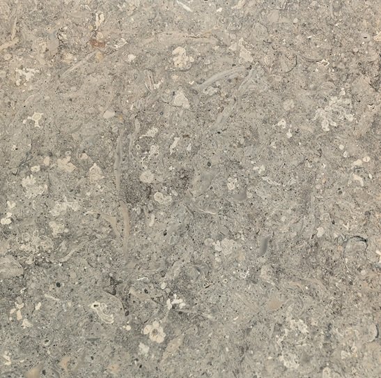 Grigio Limestone presents a medium gray field with a dense layering of fossil fragments and mineral inclusions dispersed throughout the surface. Tonal variation shifts subtly between warm and cool gray, while embedded organic forms create a finely textured composition. From a distance, the stone reads as even and consistent, with its detail becoming more apparent upon closer inspection.