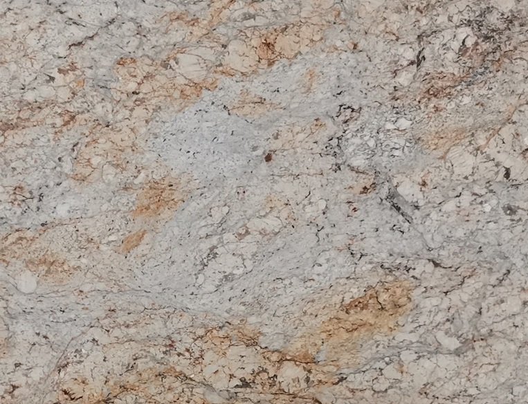 Hawaii Granite presents a light cream to soft beige field layered with sweeping mineral movement in warm gold, muted rust, and soft gray undertones. Broad, irregular formations move across the surface in interwoven patterns, with darker mineral concentrations appearing intermittently, creating a surface that feels active yet balanced without a fixed direction.