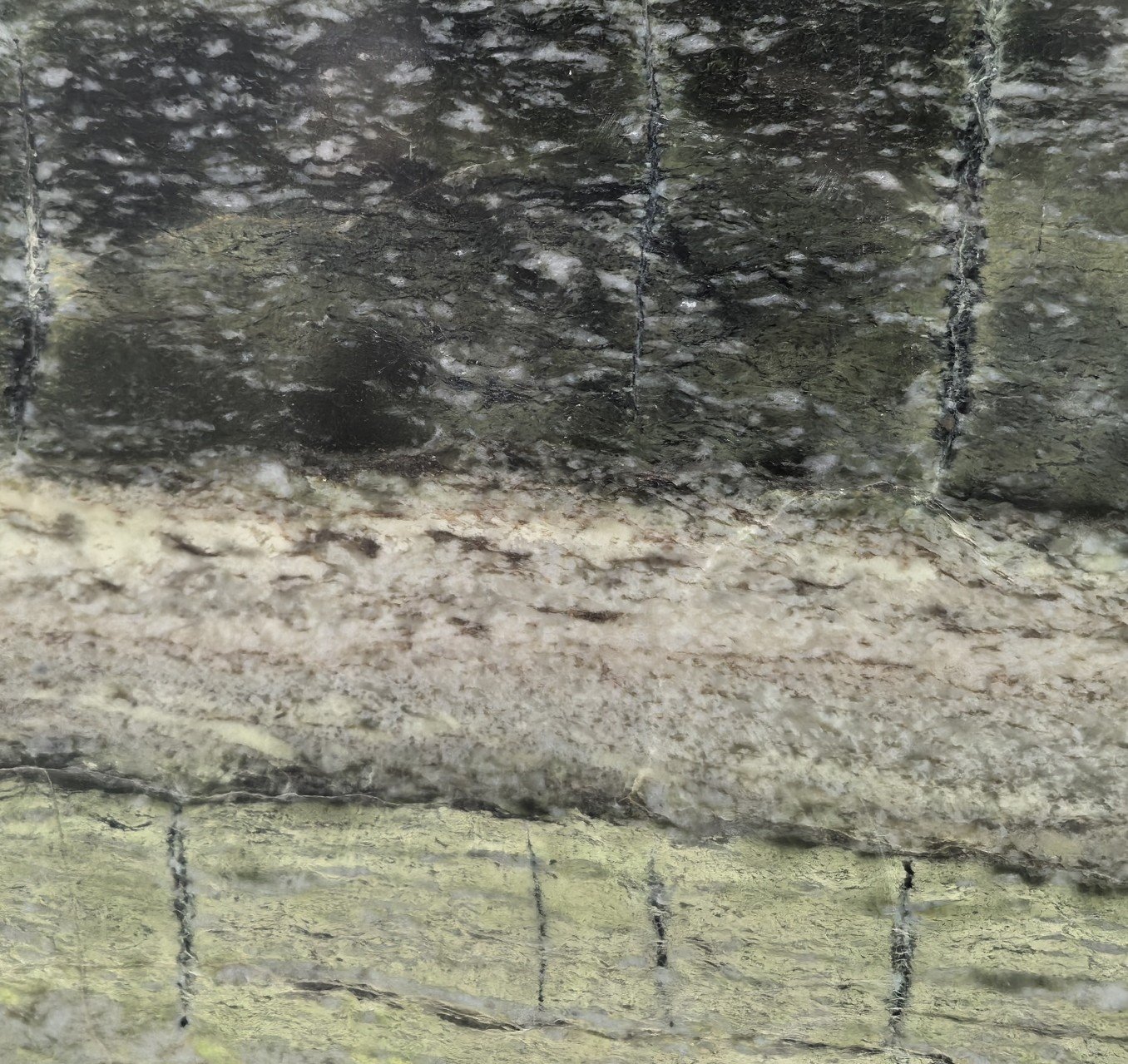 Irish Green Marble is a visually powerful natural stone defined by bold banding of deep forest green, near-black, olive, and pale celadon arranged in broad, layered strata. Flashes of white and cream mineral deposits punctuate the darker ground, while occasional hints of soft lavender and taupe appear within the transitional bands, adding unexpected complexity to an already richly textured surface. No two slabs of Irish Green Marble read alike — the stone's geological layering produces a composition that is raw, elemental, and unmistakably distinct.
