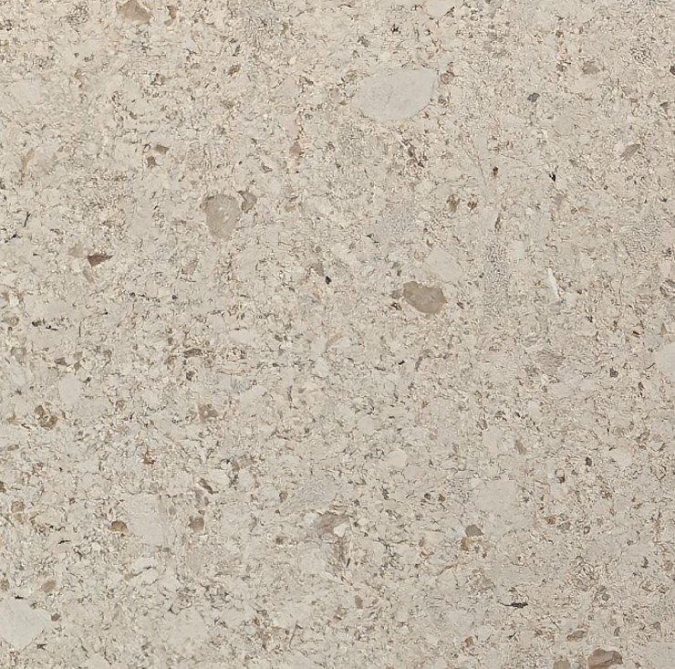Louvre Cream Limestone presents a soft cream background with a finely textured composition of small fossil fragments and mineral inclusions distributed across the surface. Subtle tonal variation moves gently through the stone, creating a consistent field of warm neutral color punctuated by delicate organic forms. Louvre Cream Limestone carries a refined, understated character where the dense arrangement of natural inclusions adds visual interest while maintaining an overall calm and balanced appearance.
