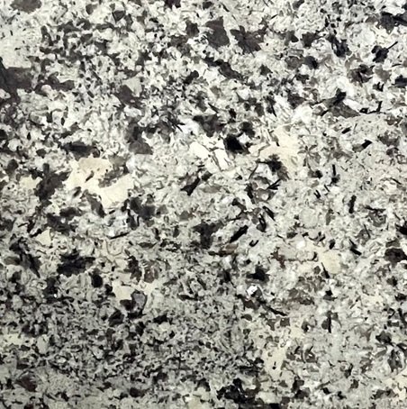 Oyster White Granite presents a light gray to off-white field composed of interlocking crystalline structures with scattered charcoal and deep mineral inclusions. The surface combines fine granular texture with larger, irregular formations that create a layered, fractured appearance. Darker mineral clusters appear intermittently throughout, introducing contrast and movement across the pale background.