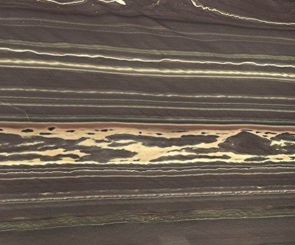 Red Bamboo Granite presents a dark, linear composition defined by horizontal bands of deep brown, charcoal, and muted red tones, intersected by irregular seams of lighter mineral deposits. Thin, continuous lines run parallel across the surface, while intermittent areas of disrupted patterning introduce moments of contrast and visual intensity. The overall effect is strongly directional, with a layered structure that reads clearly across the full length of the slab.