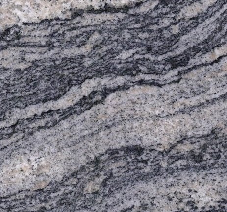 Silver Wave Granite reveals a dynamic composition of flowing, layered bands that move across the surface in alternating tones of charcoal, graphite, and soft silver-gray. The pattern shifts between tightly compressed striations and broader, undulating sweeps, creating a sense of motion that reads almost like sedimentary layering. Subtle variations in grain density and contrast give the material depth without overwhelming the overall composition, allowing the movement to remain legible across the full face of the stone.