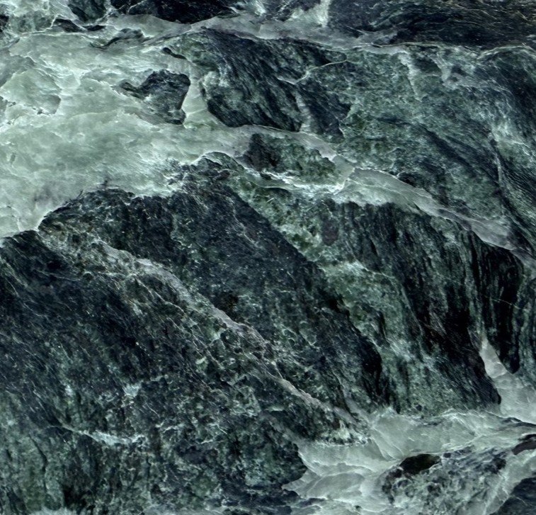 Verde St. Denis Marble displays a complex composition of deep forest green and dark charcoal tones layered with lighter jade and mineral veining. Large areas of darker green are intersected by branching networks of pale green and white calcite veins that move dynamically across the surface. The pattern is highly expressive, with sweeping mineral formations and crystalline textures that create strong visual contrast between dense green fields and luminous veined structures.