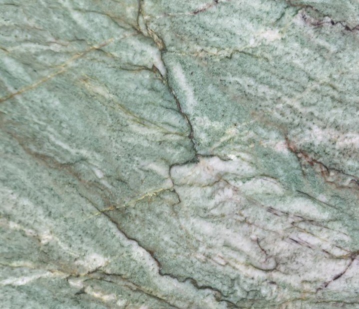 Acquiem Quartzite is a soft green quartzite layered with sweeping bands of sage, celadon, and pale ivory. Fine charcoal veining and delicate golden threads move diagonally across the surface, giving the stone a sense of fluid motion and natural depth.