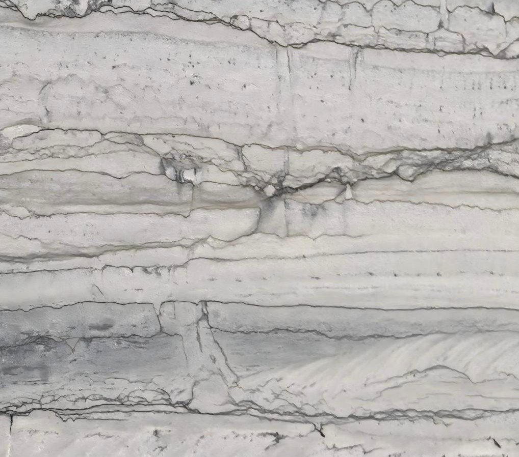 Artemis Granite is a dramatic white and soft gray granite defined by sweeping horizontal mineral movement and layered tonal variation. Broad fields of pale white transition into misted gray striations, intersected by fine charcoal tracings that articulate the stone’s natural formation. Subtle shifts between cool gray and light ash create depth across the surface, giving the material a composed yet dynamic presence.