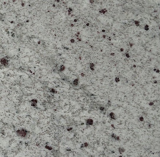 Astoria Cream Granite displays a pale white to light gray background composed of tightly interlocked crystalline minerals. Small garnet-colored inclusions appear intermittently across the surface, accompanied by soft gray mineral clusters and subtle tonal variation. The overall pattern is fine to medium grained and evenly dispersed, giving Astoria Cream Granite a balanced and consistent visual character.