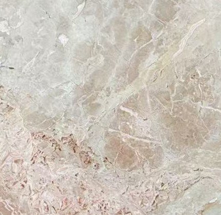 Breccia Aurora Marble displays a softly blended composition of warm beige, pale blush, and muted ivory, interwoven with diffuse veining and fragmented brecciated forms. Subtle washes of pink and faint green-gray move across the surface, giving the stone a layered, almost painterly quality with gentle variation rather than sharp contrast.