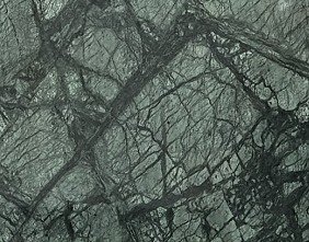 Emerald Green Granite is a deep, richly saturated granite with a dark forest and hunter green base threaded by dense networks of near-black veining that branch and intersect across the surface in fine, irregular patterns. Silver and pale green mineral concentrations are distributed throughout, catching light against the darker tones and adding subtle contrast to the overall composition. The color is consistent and intense across the full face of the stone, with tonal depth that shifts between cooler and warmer green hues depending on the light conditions.